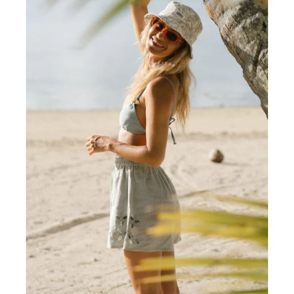 De Buckley Buckethat keert dit seizoen terug met een nieuwe print die perfect past bij de resortcollectie en andere Aqua Grey-modellen, voor een afgestemde outfit. Deze lichtgewicht en ademende hoed is ontworpen om je zomerse look af te maken en geeft je strand- of zwembadoutfit een nonchalante, stijlvolle touch. Hij biedt zowel bescherming tegen de zon als comfort en is daarmee het ideale accessoire voor zonnige dagen. Combineer hem met je favoriete zwemkleding of strandjurkje voor een samenhangende, resort-ready look.
