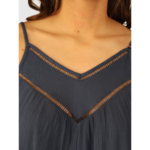 Deze mooie losvallende A-lijn top is gemaakt van viscose. Het heeft verstelbare bandjes en kanten details met een striksluiting op de rug.