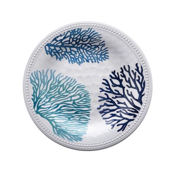Marine Business Harmony Mare dinerbord. Dit stijlvolle dinerbord in de kleur wit lijkt gemaakt van echt aardewerk maar is onbreekbaar en gemaakt van hoge kwaliteit melamine. Het ontbijtbord is gedecoreerd met een stijlvol koraalmotief in verschillende kleuren blauw en daarom een sieraad voor uw nautisch gedekte tafel op de boot. Het Marine Business Harmony onbreekbare watersport servies is gemaakt van 100% melamine, BPA vrij en vaatwasmachinebestendig. Dit scheepsservies is perfect voor gebruik aan boord.