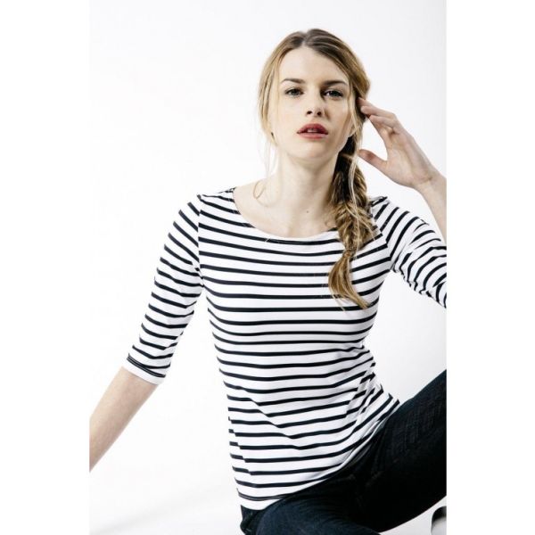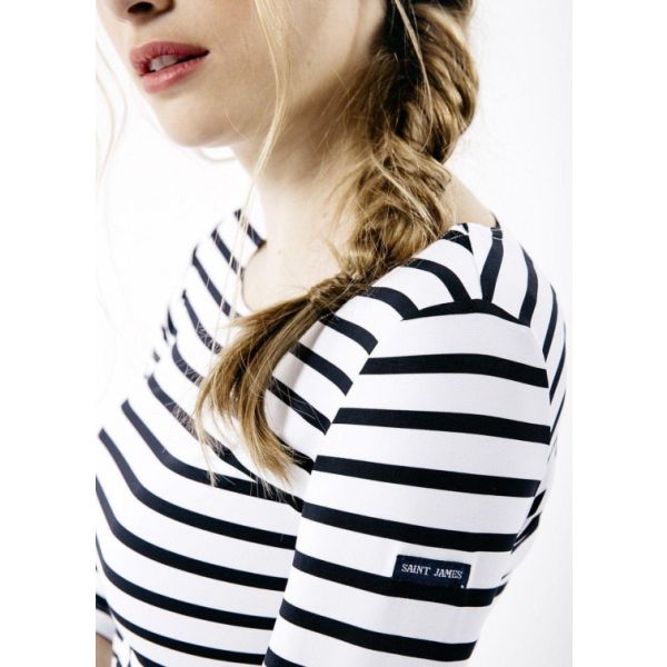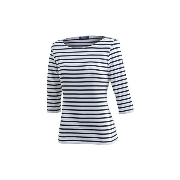Het bekende Bretonse gestreepte shirt van Saint James in een getailleerde damesuitvoering. De Garde-Côte lll R heeft 3/4 mouwen, een wijd uitgesneden hals en is gemaakt van polyamide-microfiber (Meryl) dat beschermt tegen schadelijke UV-stralen. Meryl behoort tot de nieuwe groep hoogwaardige synthetische vezels. Deze polyamide microvezel biedt twee keer zoveel bescherming voor de huid dan katoen. Ook is het shirt ademend, licht van gewicht, sterk, zacht, super stretchend, vocht en geur regulerend en blijft mooi. Het is gemakkelijk in onderhoud en droogt zeer snel.