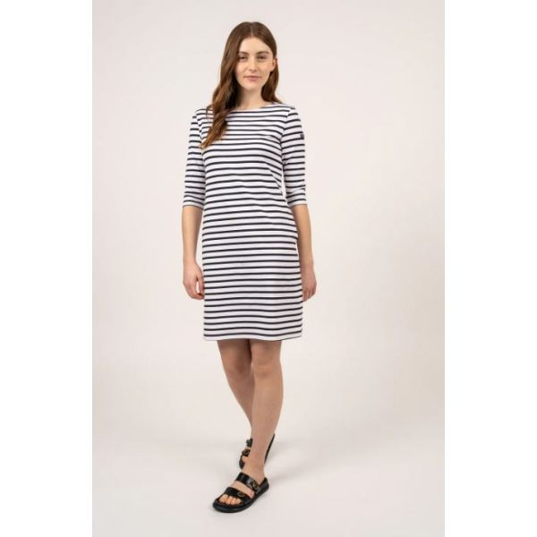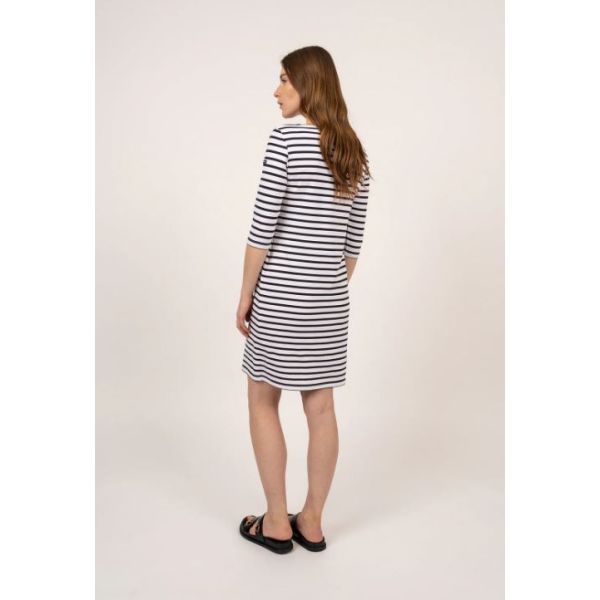De Propriano is een charmant jurkje met iconische Bretonse streep. De jurk heeft 3/4 mouw en ronde hals. Heerlijk zomers jurkje, gemaakt van polyamide-microfiber (Meryl) dat beschermt tegen schadelijke UV-stralen. Meryl behoort tot de nieuwe groep hoogwaardige synthetische vezels. Deze polyamide microvezel biedt twee keer zoveel bescherming voor de huid dan katoen. Ook is het shirt ademend, licht van gewicht, sterk, zacht, super stretchend, vocht en geur regulerend en blijft mooi. Het is gemakkelijk in onderhoud en droogt zeer snel.